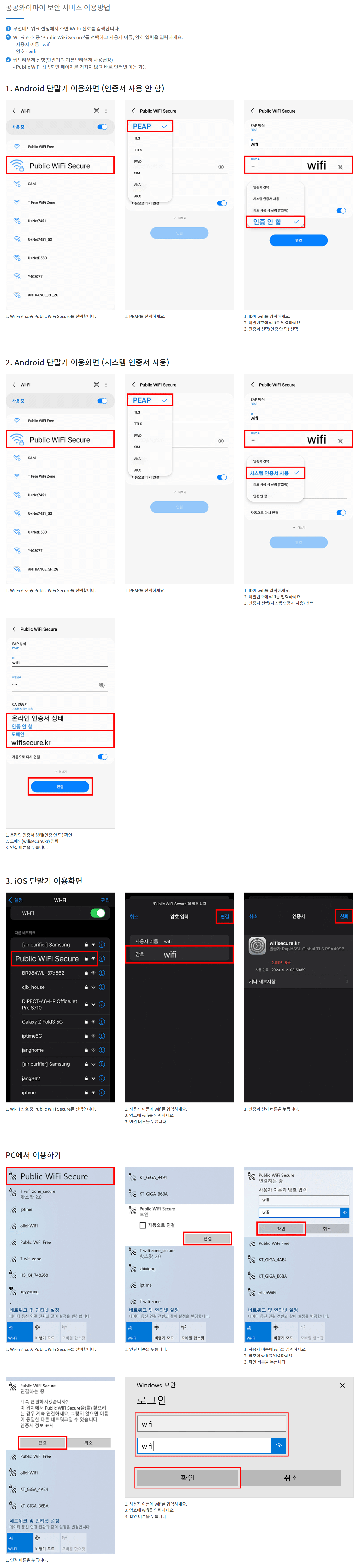 안드로이드폰, 아이폰, 일반PC에서 공공 와이파이 서비스 이용방법은 아래에서 확인하실 수 있습니다.